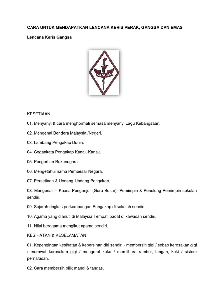 Menunjuk cara menyediakan tapak semaian dan memindahkan semaian ke batas yang telah disediakan. A) lencana kemajuan 3.cara berhentikan 3.ceramah b) lencana darah drp.hidung. Menunjuk cara memberi isyarat tangan semasa berbasikal. Boleh menyanyikan lagu kebangsaan "negara ku" dan menghormati lagu itu ketika dimainkan. Anti dadah atau bahaya merokok, atau keracunan makanan. Menyanyi lagu kebangsaan negaraku dan memahami 122 bagaimana menghormati lagu itu ketika dimainkan.